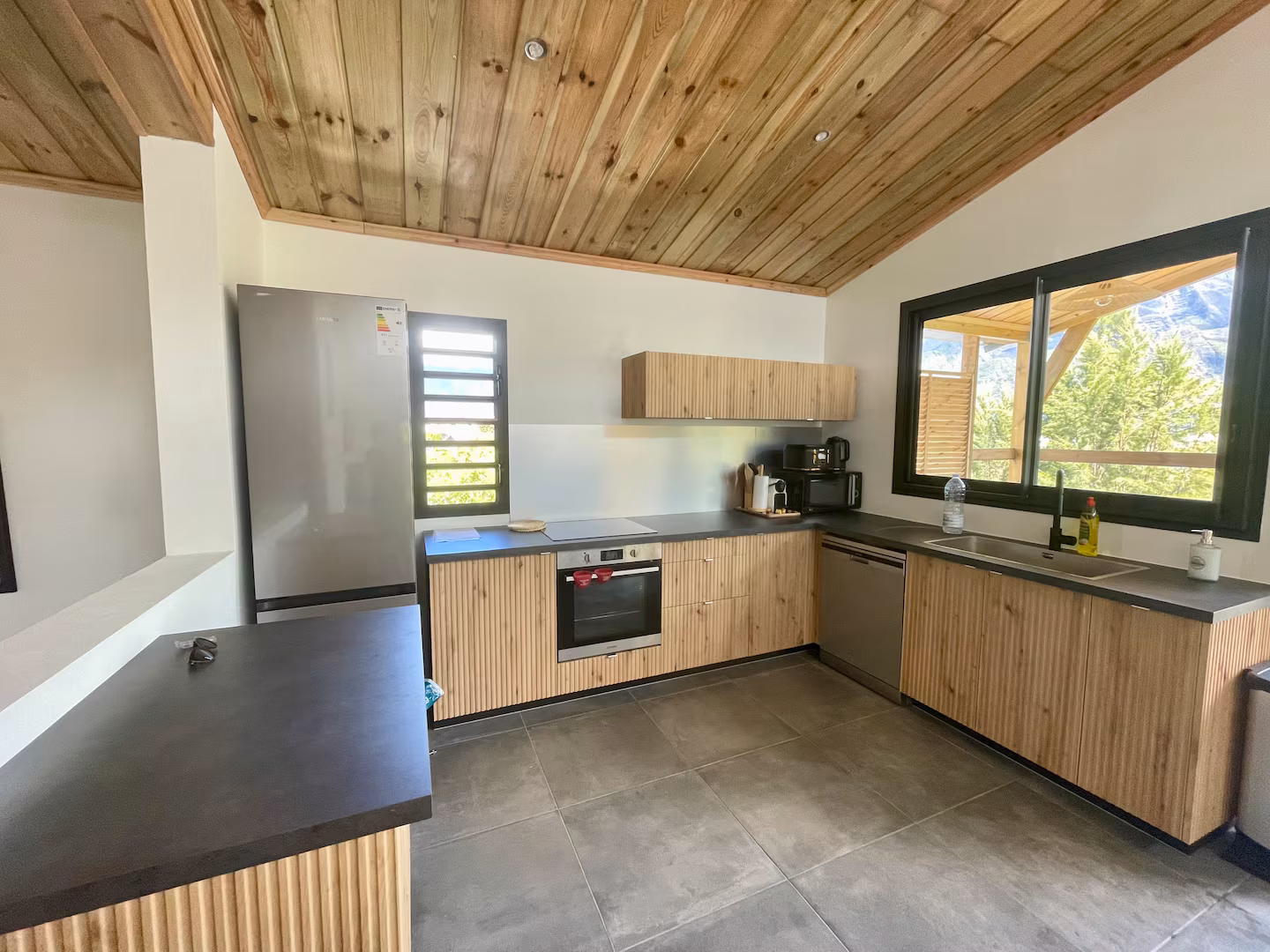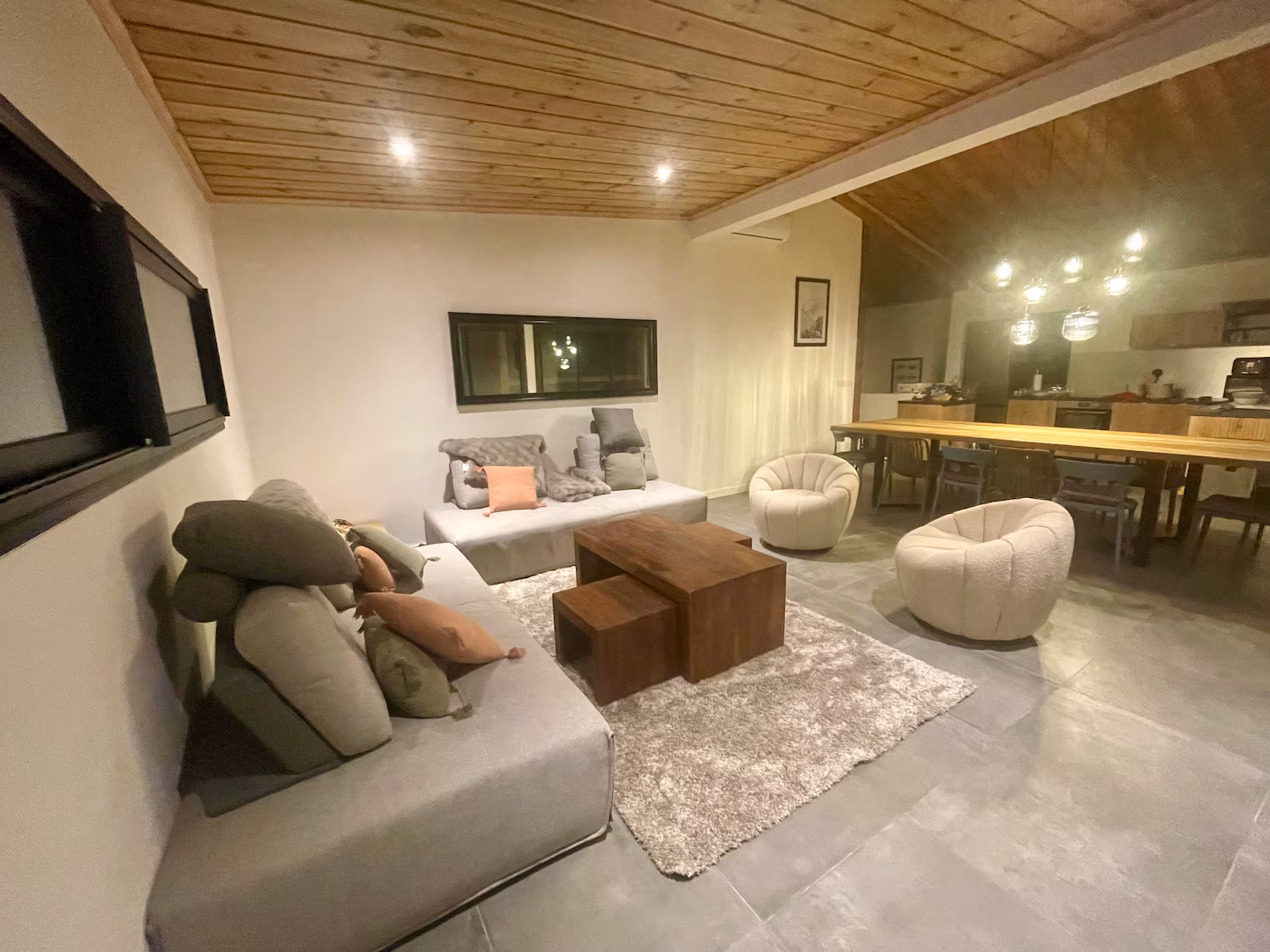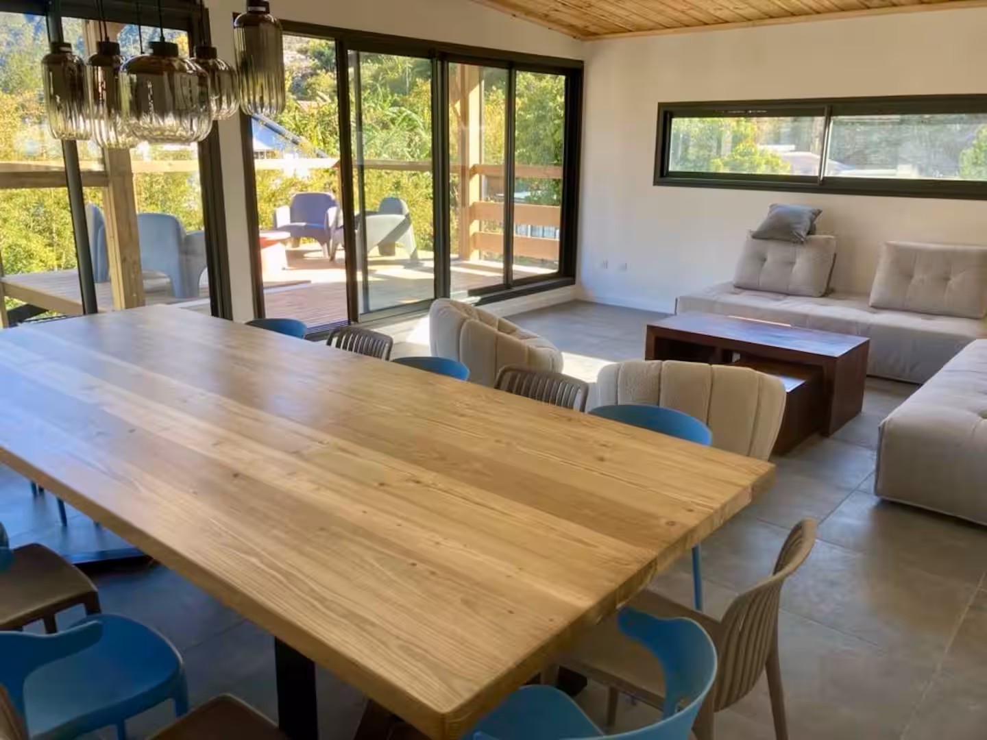 - Une grande pièce à vivre avec un salon agréable, une grande table pour manger confortablement à 12, une cuisine tout équipée et une climatisation réversible
