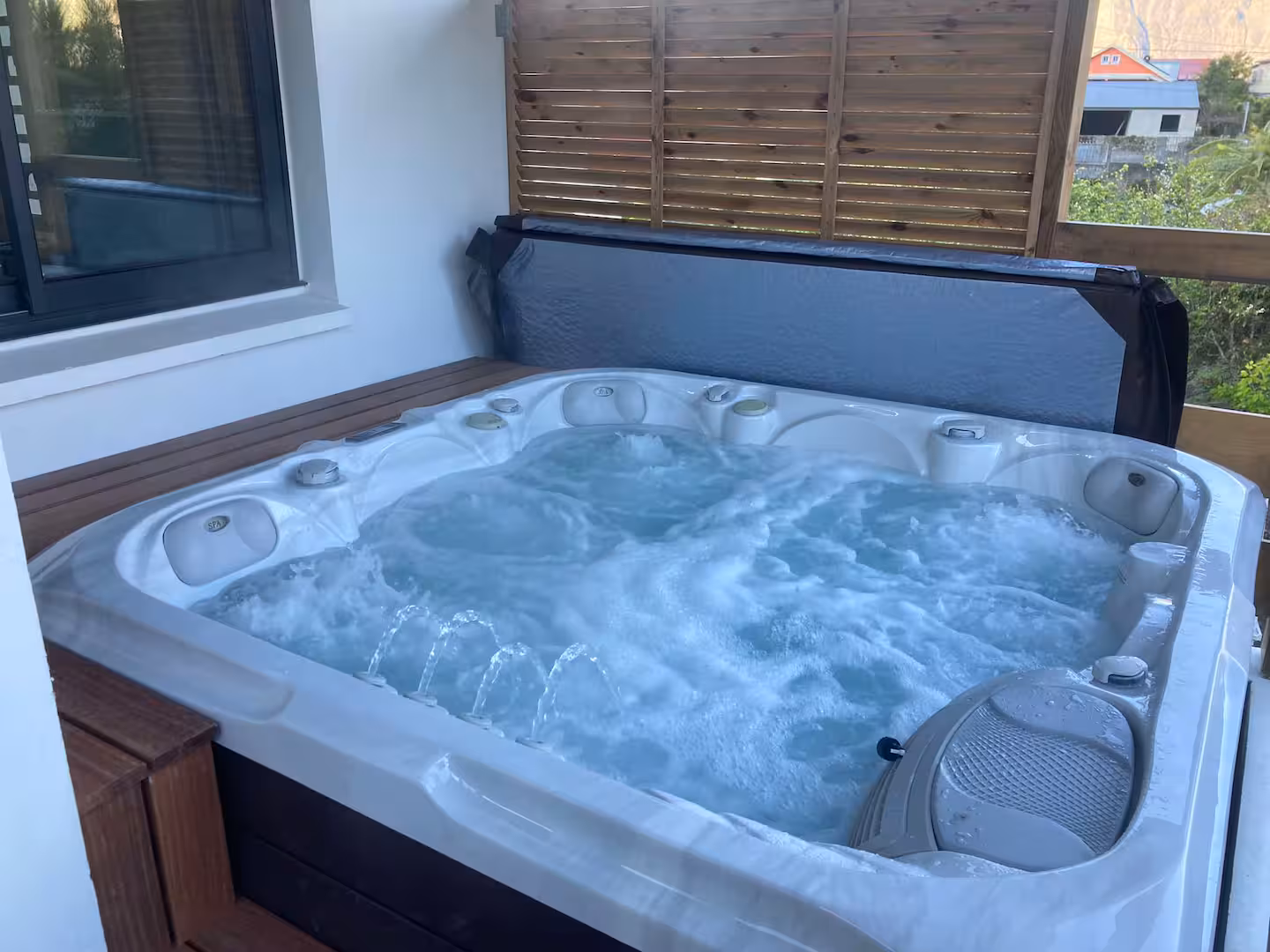 - Un agréable balcon qui dessert l’espace jacuzzi et une terrasse offrant une vue panoramique